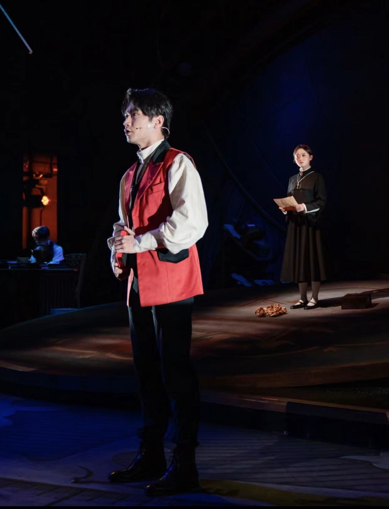 从舞台化的角度来看,伽利略与开普勒在戏中并没有见到彼此,因此两人的对话其实从未在真实的空间中展开。但音乐剧《星际信使》却营造出了两人似是在梦想的宇宙中与对方交谈的场景。如果把整体空间看作一个完整的宇宙,那么倾斜舞台区域被灵活运用的多媒体视频则好比两人一起向外眺望的窗户——这也是两人分享各自观察与思考的空间所在。